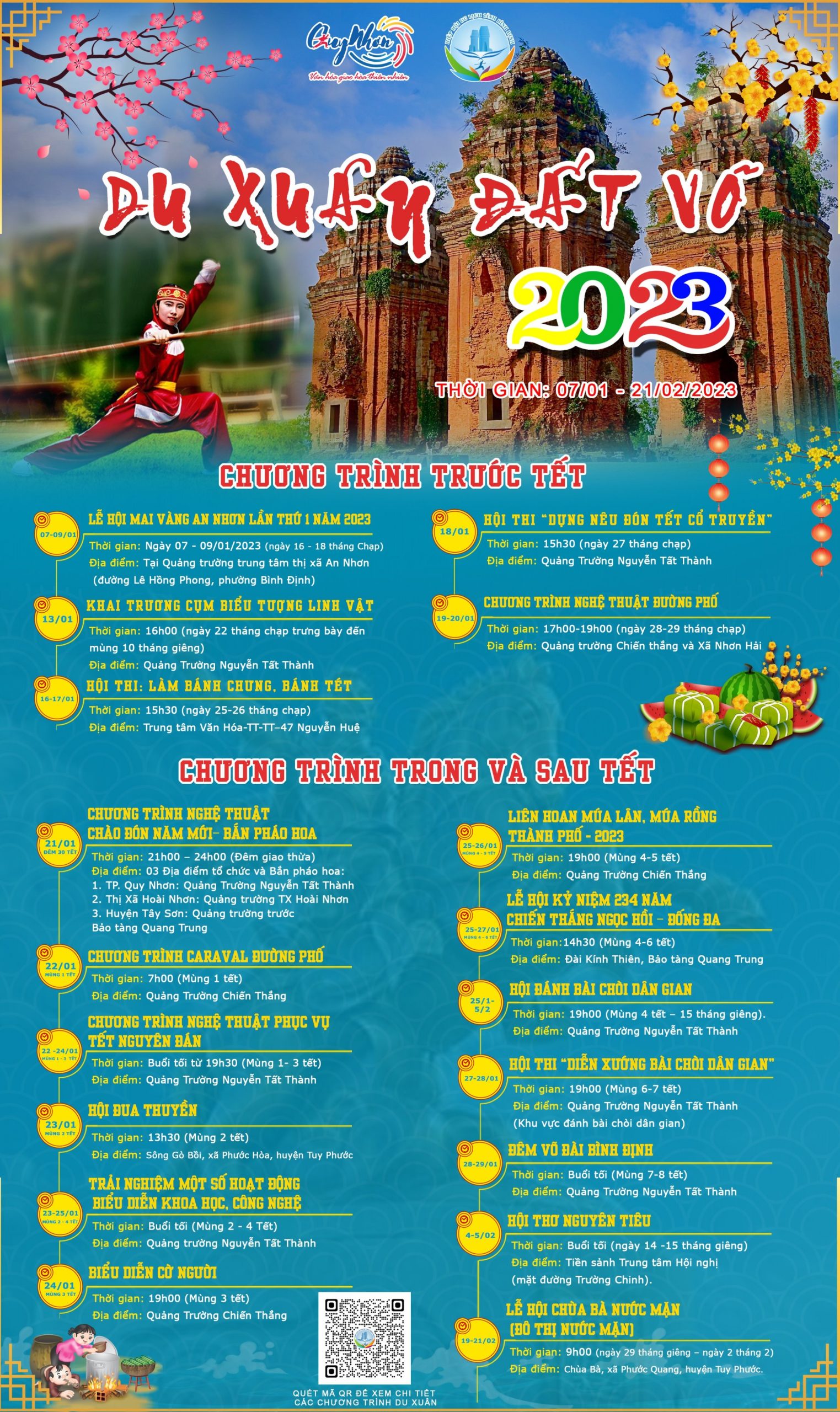 Nhằm đáp ứng nhu cầu vui xuân, vãn cảnh và khám phá trải nghiệm trong dịp Tết Nguyên đán Quý Mão 2023 sinh động và đặc sắc, tỉnh Bình Định tổ chức các chương trình Lễ hội và hoạt động văn hóa nghệ thuật rất phong phú, hấp dẫn xuyên suốt dịp Lễ Tết này.